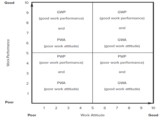 The y-axis of the graph is labeled work performance, and the x-axis is labeled work attitude. Both axes are marked from zero to ten. The beginning of both axes is marked poor, and the ends of both axes are marked good.